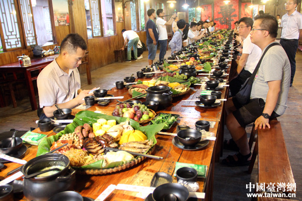 两岸媒体记者在巴马体验瑶族长桌宴。(中国台湾网 王怡然 摄)