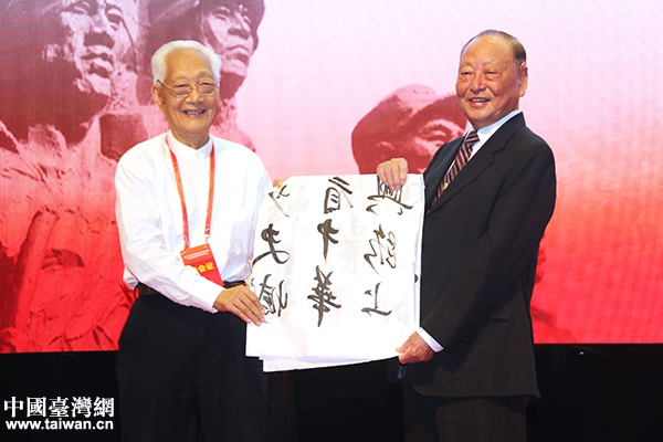 中国抗日战争史学会理事方祖岐(左)向中华民族抗日战争纪念协会荣誉副理事长王文燮致赠墨宝。(中国台湾网 陈佳慧 摄)