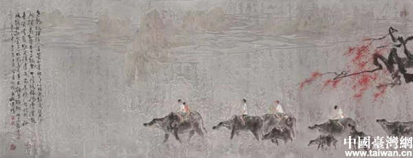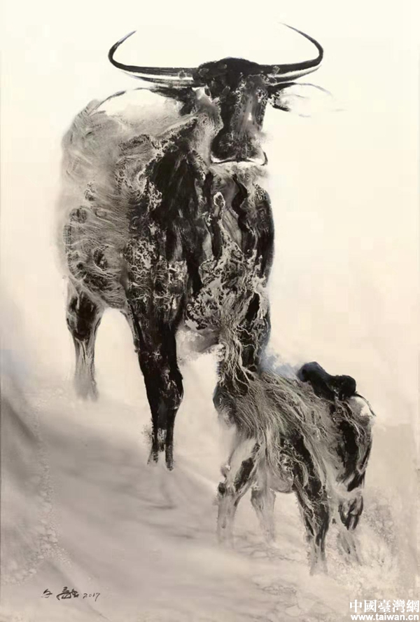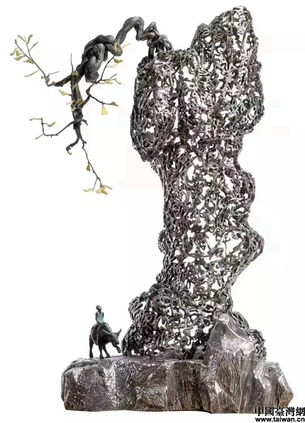 “线条”一直以来是东方艺术强调的核心表征,因此许文融选择“线条”作为他水墨、油画及雕塑等不同媒材创作上的连结。此次来苏州展览的作品既有水墨、油画作品,也有雕塑。他的“文人草书雕塑”系列,以不锈钢或青铜作为媒材,运用草书书写古代诗文,成为诗、书、境、形于一体的三度空间立体雕塑。如《醉月》《行云》等作品,通过李白、苏东坡的诗词与形象连结,形成另一种东方形而上的美学驰想。这种艺术的抽象,也存在于他的水墨作品如《青山绿水任遨游》《云山多自在》等一系列的意象画中。“西方的雕塑手法也可以运用于东方传统水墨画之中,”许文融介绍说,这两幅水墨画背景都以金石碑帖的反白字书法为底,辅以留白,线条交错勾勒,象征高山流水,然后再勾画牧童、牛等,使具象与抽象产生对话。