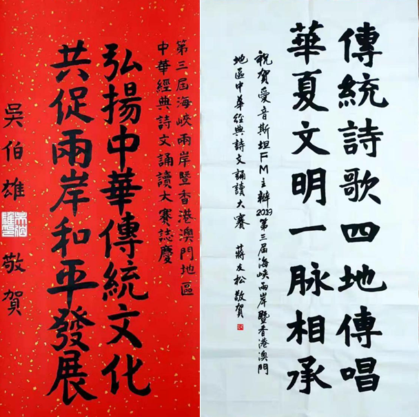 前中国国民党主席吴伯雄与海峡两岸和谐文化交流协进会名誉会长蒋友松为大赛题词。(图片来源:主办方供图)