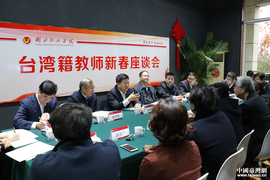 中共中央台办、国务院台办副主任龙明彪与湖北经济学院台籍教师座谈交流。(中国台湾网 李宁 摄)