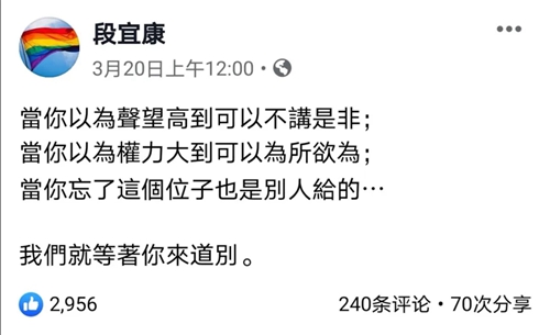 不久前,民进党前民代段宜康在脸书上发文,称“当你以为声望高到可以不讲是非;当你以为权力大到可以为所欲为;当你忘了这个位子也是别人给的?我们就等着你来道别”。虽然没有直接点名,但明眼人一看就知道说的是苏贞昌。段宜康这段话被认为是选后民进党内新潮流系与苏系权力斗争的公开化。
