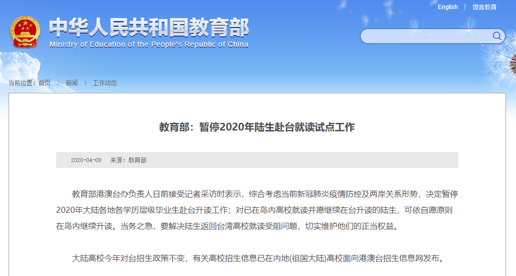 就暂停2020年陆生赴台升读工作这件事来说,原因教育部港澳台办负责人已经说得很清楚:一是当前新冠肺炎疫情防控形势,二是两岸关系形势。