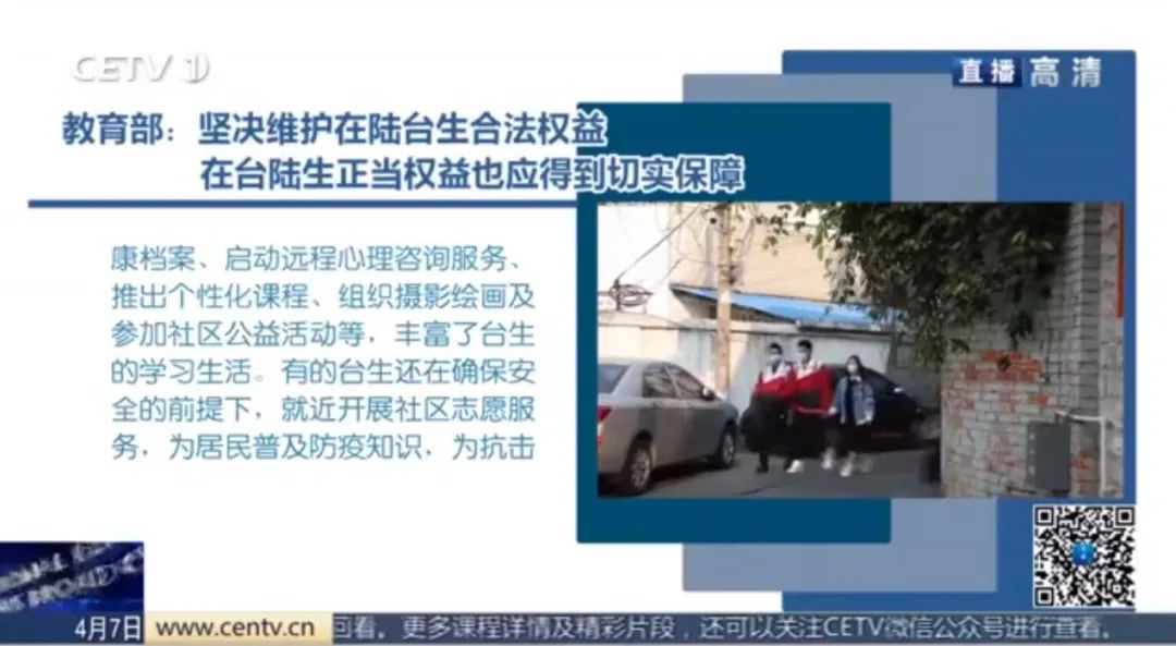 疫情发生后,大陆教育部门要求大陆各高校精准了解每位在读台湾学生情况,落实属地防疫措施,提醒台生做好自身防护,确保台生健康有保障,组织开展线上教学,“停课不停学”。很多高校为台生推出了一系列暖心举措,丰富在陆台生学习生活。目前,在陆台生无一感染。