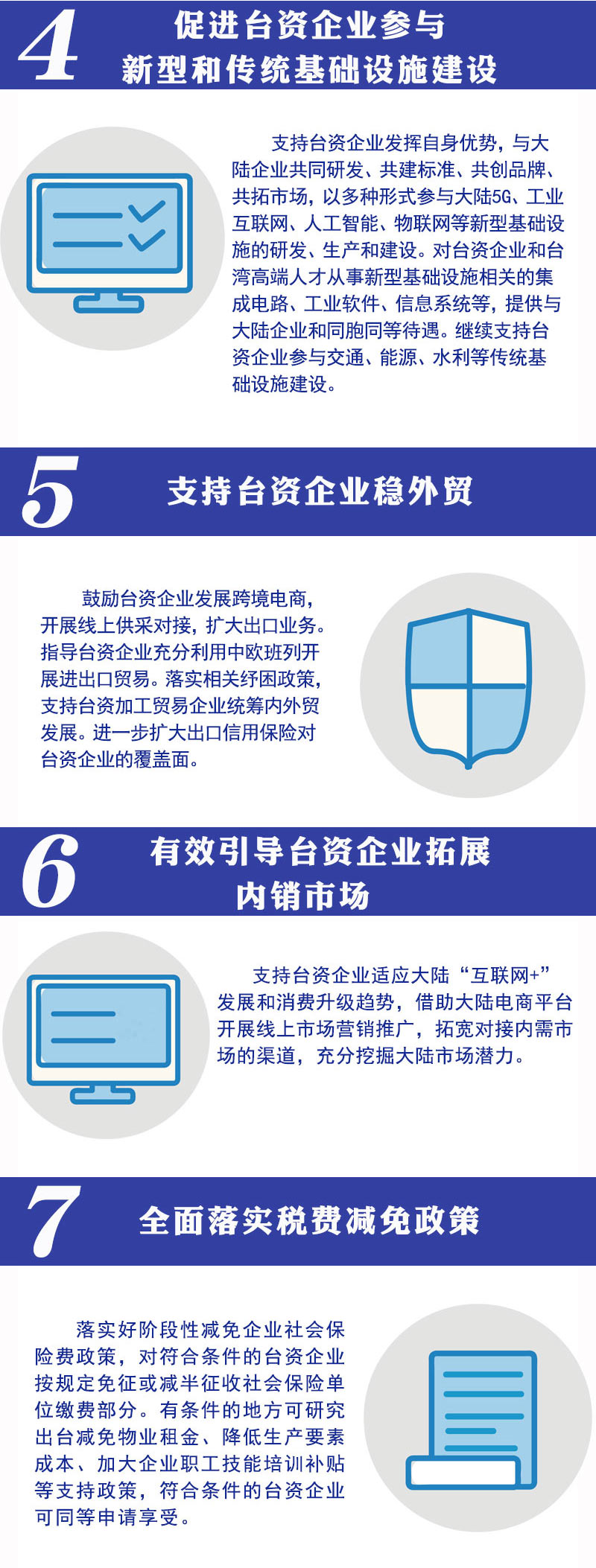 15日,国家发展改革委、国务院台办、工业和信息化部等十部门联合印发了助力台企“11条措施”。相关措施将进一步帮助广大台商台企应对疫情和复工复产,为台商台企提供更多发展机遇、同等待遇,对台商台企在大陆投资兴业给予更有力支持。
