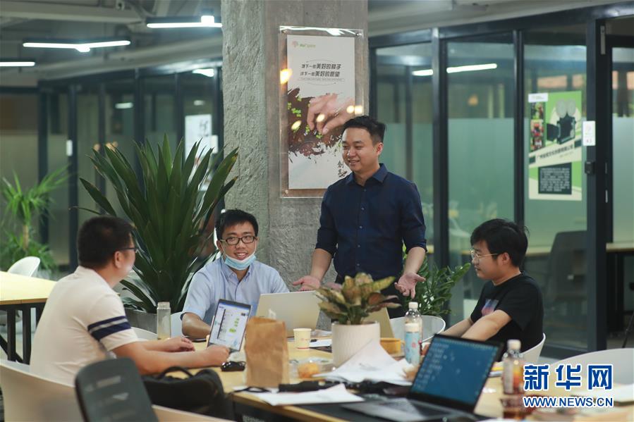 5月18日,陈鸿杰(右二)在汇龙台港澳青年创新创业基地与工作人员讨论工作。新华社记者卢烨摄