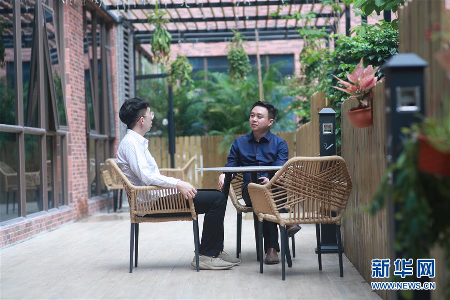 5月18日,陈鸿杰(右)在汇龙台港澳青年创新创业基地与工作人员讨论工作。新华社记者卢烨摄