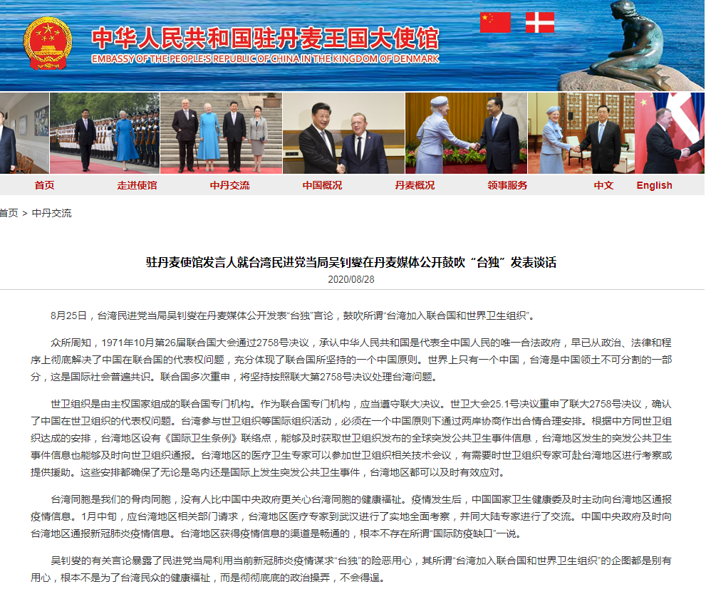 驻丹麦使馆发言人就台湾民进党当局吴钊燮在丹麦媒体公开鼓吹“台独”发表谈话