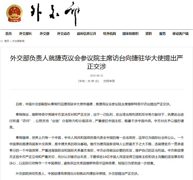 外交部负责人就捷克议会参议院主席访台向捷驻华大使提出严正交涉。(外交部网站截图)