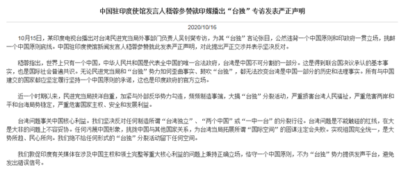 中国驻印度大使馆16日就印媒播出“台独”专访发表严正声明。