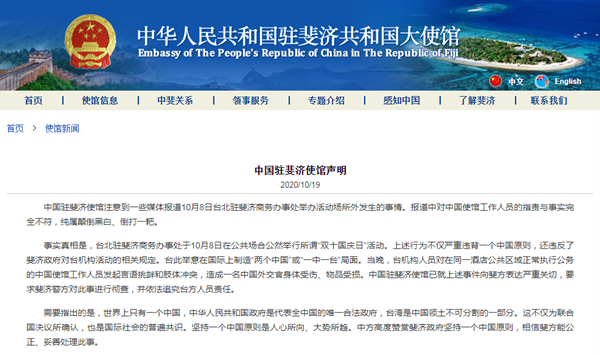 中国台湾网10月20日讯 中国驻斐济使馆19日发布声明表示,中国驻斐济使馆注意到一些媒体报道10月8日台北驻斐济商务办事处举办活动场所外发生的事情。报道中对中国使馆工作人员的指责与事实完全不符,纯属颠倒黑白、倒打一耙。