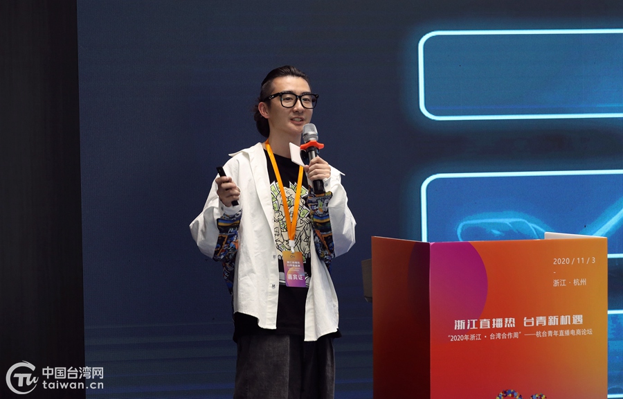抖音潮玩类知名网红—阳台哥介绍自己在直播电商行业的创业经历。(中国台湾网 尹赛楠 摄)