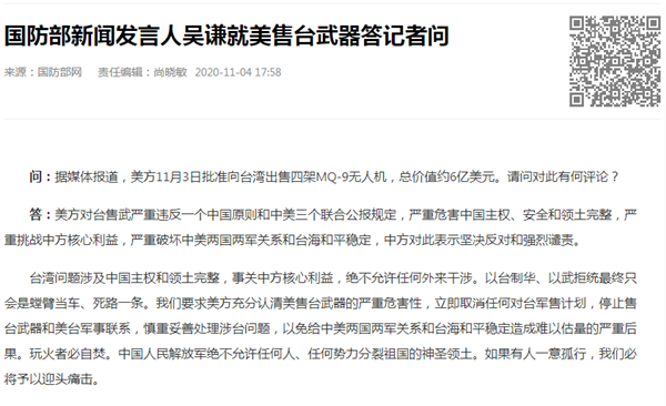 中国台湾网11月5日讯 国防部新闻发言人吴谦4日就美售台武器答记者问。针对有记者问:据媒体报道,美方11月3日批准向台湾出售四架MQ-9无人机,总价值约6亿美元。请问对此有何评论?