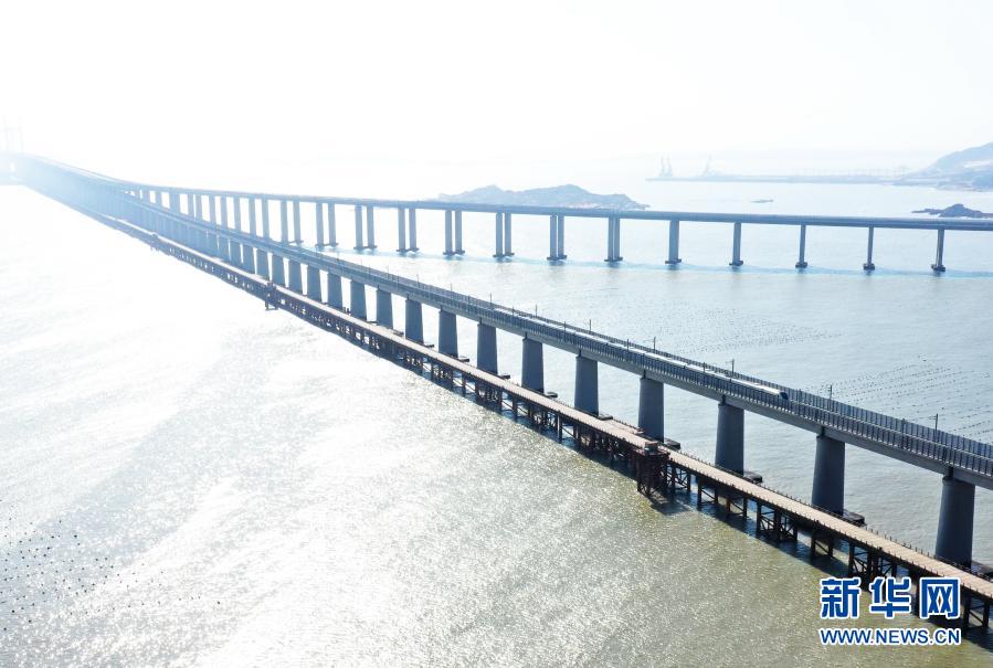 26日,当首发列车驶上这座大桥时,乘客纷纷举起手机拍照留念。当日风力超过6级,但高速行驶的列车依然平稳舒适。