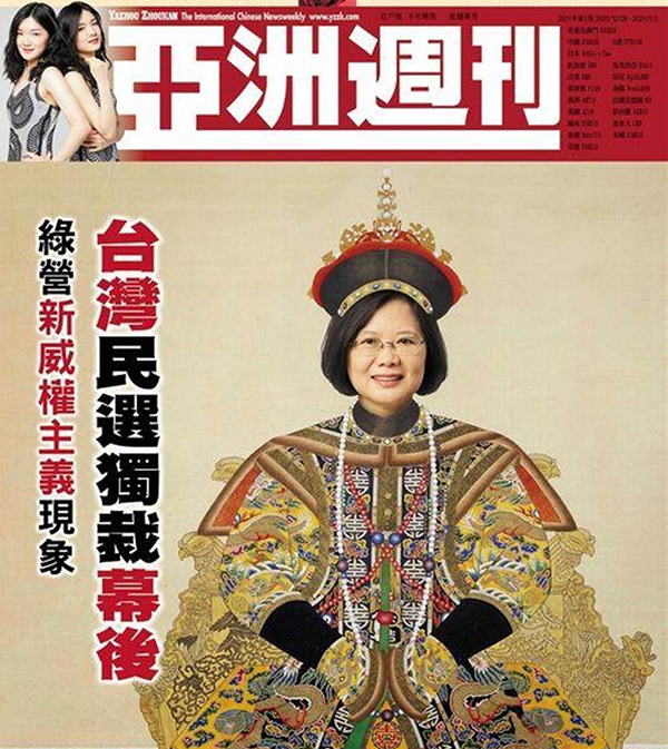 中国台湾网12月28日讯 (记者 吴怡 李柏涛)最新一期香港《亚洲周刊》以蔡英文穿龙袍的讽刺漫画为封面,专题报道台湾“民选独裁”的真相,并引述了张俊宏、林正杰、陈水扁、吕秀莲等民进党创党元老的看法,反映台湾主流民意,显示各方对台湾民选领袖“走向独裁”的忧虑。多位两岸学者认为,“民选独裁”是对蔡英文最贴切的评语,也是民进党及蔡英文甩不了的烙印,也佐证了所谓“台式民主”在台湾几十年实践的失败,台湾民众要思考下次选举时,是否还要投票给民进党。