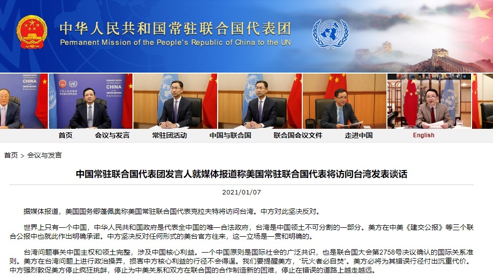 中国联代团发言人:坚决反对美常驻联合国代表访台。(图片截自官网)