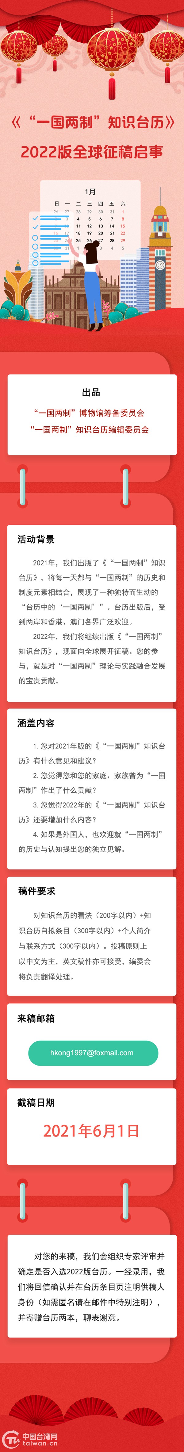 2022年我们将继续编辑出版《“一国两制”知识台历》。现面向全球征稿,您的参与就是对“一国两制”与国家发展的宝贵贡献。征稿范畴涵盖如下内容:您对2021年版的《“一国两制”知识台历》有什么意见和建议?您觉得您和您的家庭、家族曾为“一国两制”作出了什么贡献?您觉得2022年的《“一国两制”知识台历》还要增加什么内容?同时也欢迎国际社会各界人士就“一国两制”的历史与认知提出独立见解。