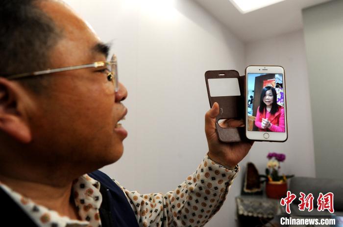 台商曾文子的丈夫吴锡祺与台湾朋友视频连线拜年。 张金川 摄