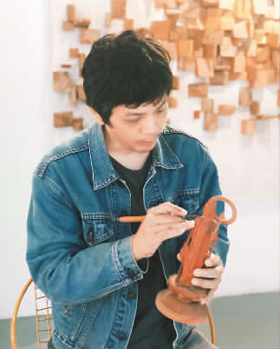 陈峙峰在雕刻作品。受访者供图