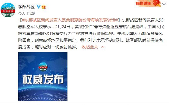 中国台湾网2月25日北京讯 据@东部战区 微博25日消息,东部战区新闻发言人张春晖空军大校就美舰穿航台湾海峡发表谈话表示,2月24日,美“威尔伯”号导弹驱逐舰穿航台湾海峡,中国人民解放军东部战区组织海空兵力全程对其进行跟踪监视。美舰此举人为制造台海风险因素,刻意破坏地区和平稳定,我们对此表示坚决反对。战区部队时刻保持高度戒备,随时应对一切威胁挑衅。(完)