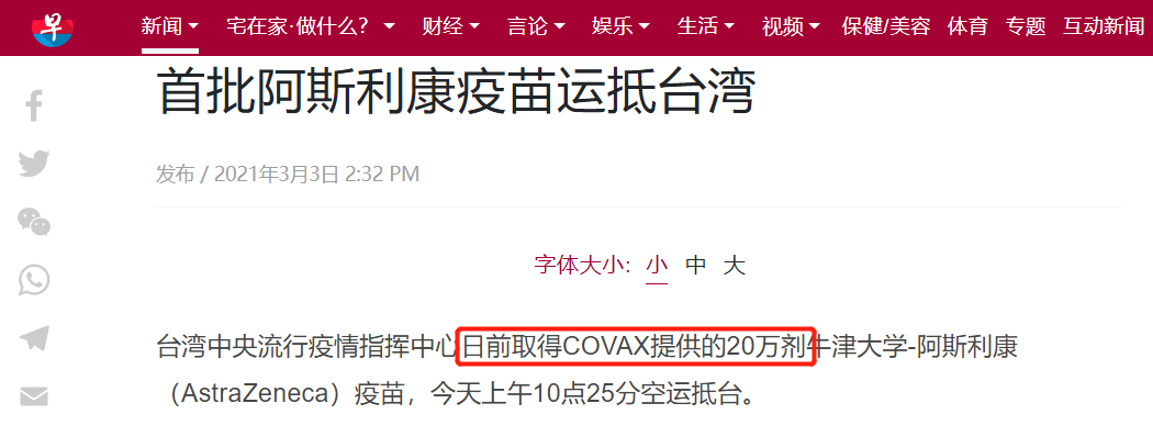 除了疫苗来源外,该消息的另一个争议点则是首批抵台疫苗的总数。新加坡《联合早报》的报道中沿用了疫苗来自COVAX平台的说法,并表示这批疫苗的总剂量是20万剂,而不是台湾“中央社”和RFI所写的11.7万剂。