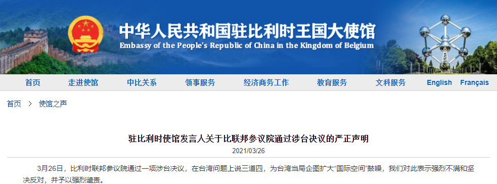 海外网3月27日电 据中国驻比利时王国大使馆网站消息,3月26日,比利时联邦参议院通过一项涉台决议,在台湾问题上说三道四,为台湾当局企图扩大“国际空间”鼓噪,我们对此表示强烈不满和坚决反对,并予以强烈谴责。