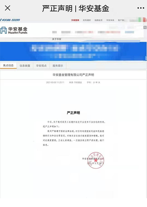 华安基金公司30日针对张某言论发表声明。(网站截图)
