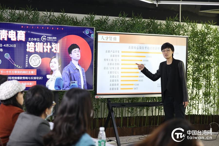 4月25日,由中国台湾网举办的海峡两岸古风茶裳直播季·台青电商培训进行中。图为发条学社CEO、新媒体电商资深从业者金风介绍短视频与直播电商现状与趋势。(中国台湾网 张秉铎 摄)