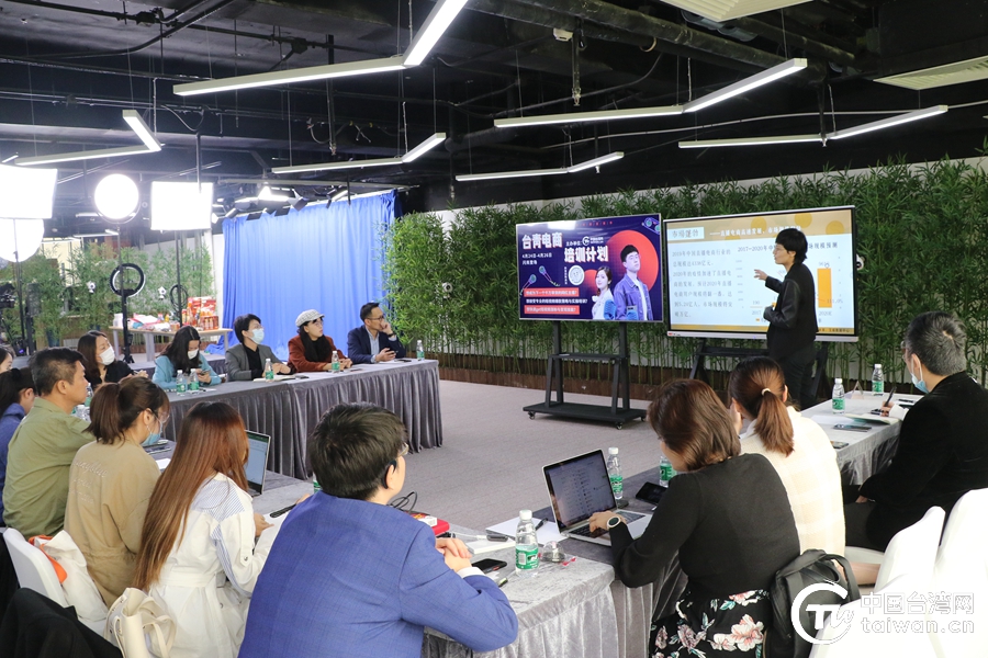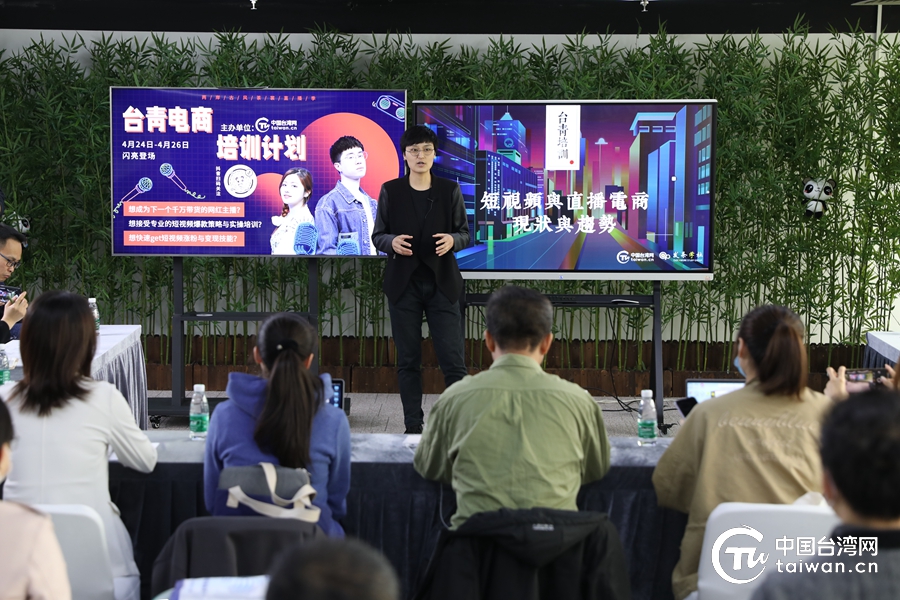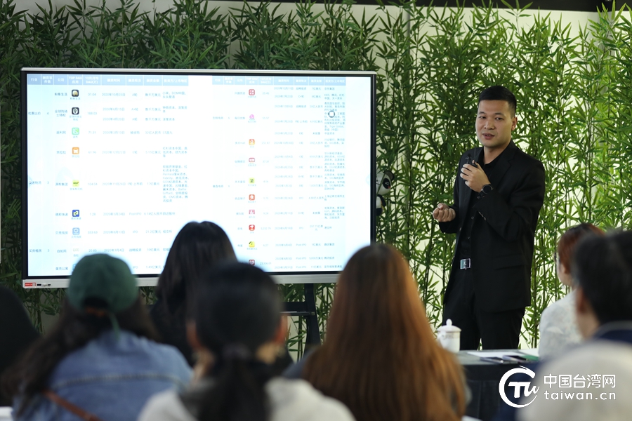 4月25日,由中国台湾网举办的海峡两岸古风茶裳直播季·台青电商培训进行中。图为发条学社CEO、新媒体电商资深从业者金风介绍短视频与直播电商现状与趋势。(中国台湾网 张亚静 摄)