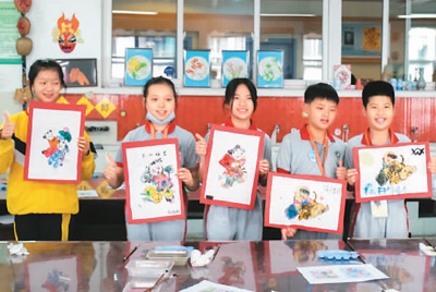 图为两岸学生展示亲手创作的年画。