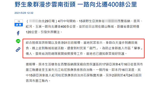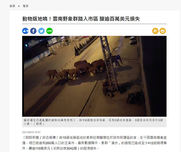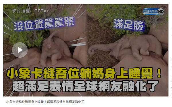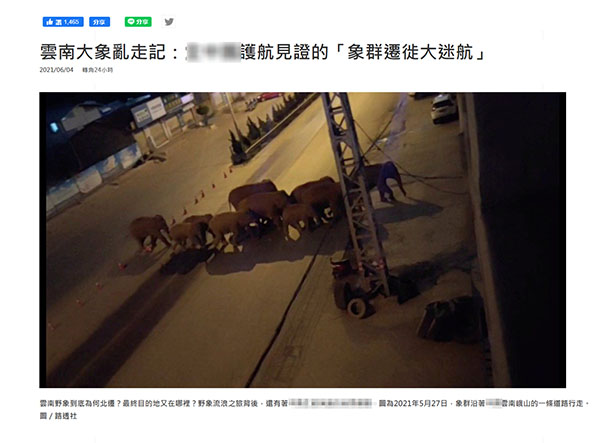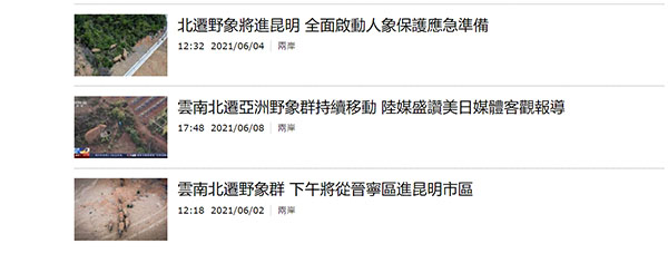 “中时新闻网”自5月底就开始关注,并陆续发布多篇文章,还将此次野象的“北迁”之旅称为“长征”,从野象群的迁徙路线,当地政府保护举措,专家观点,包括野象群发生的见闻趣事均做了详细报道。