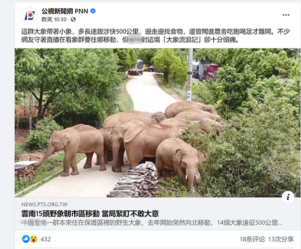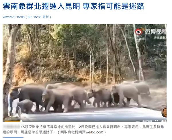 由17头亚洲野象(含中途出生的一只小象)组成的“迁徙大军”自云南西双版纳出发,一路往北方前进,超过400多公里、历时一年多终于进入到了昆明,引发全球关注。岛内包括“中央社”、《联合报》、“中时新闻网”、《自由时报》、公视新闻等在内的各家媒体发布多篇文章追踪事件进展。
