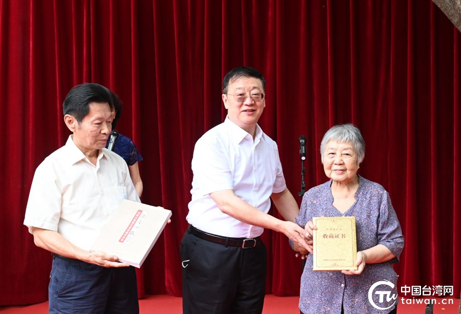 全国人大常委会委员、台盟中央常务副主席李钺锋为捐赠者梁月心、张宁颁发收藏证书。(图片来源:台盟中央)