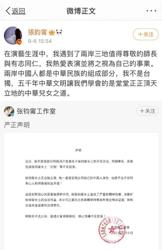 随后,张钧甯也转发工作室微博再次重申:“在演艺生涯中,我遇到了两岸三地值得尊敬的师长与有志同仁,我热爱表演并将之视为自己的事业。两岸中国人都是中华民族的组成部分,我不是‘台独’,五千年中华文明让我们学会的是堂堂正正顶天立地的中华儿女之道。”(完)