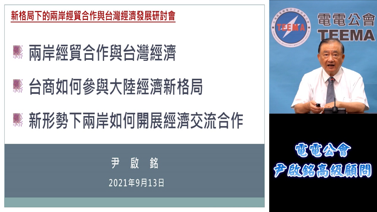 台湾电机电子同业公会高级顾问尹启铭通过视频连线,参加“新格局下的两岸经贸合作与台湾经济发展研讨会”(图片来源:视频截图)