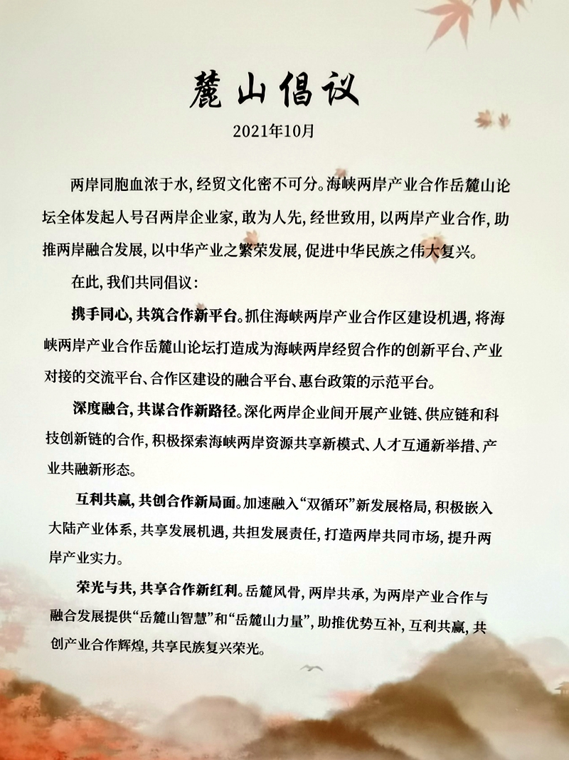 助推两岸融合发展 《海峡两岸产业合作岳麓山论坛倡议书》发布