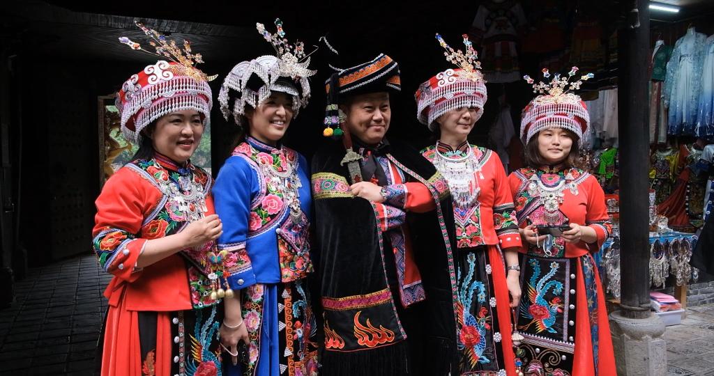 11月3日,台湾媒体记者在恩施土司城体验土家族服饰。新华社记者 贾金明 摄