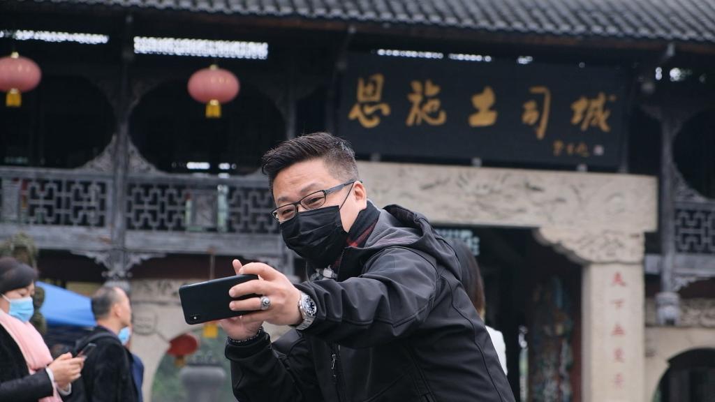 身着黑斗篷、缠上青头帕,台湾东森电视台记者杨钊在视频连线中向台湾观众介绍:“这套服装以黑色和红色为基调,色彩丰富、明艳,穿戴起来是一次难忘的体验。”