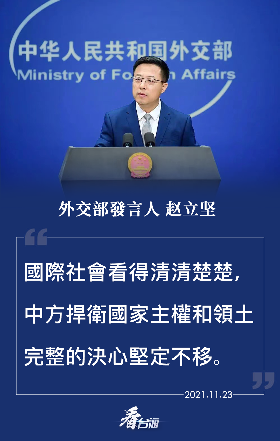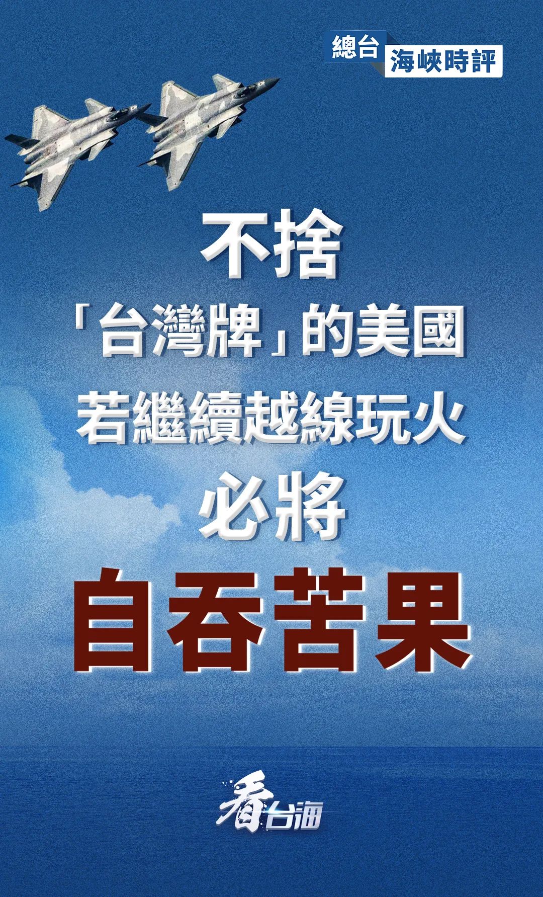 中国在台湾问题上的原则立场已经阐述得非常清楚,正如外交部发言人赵立坚23日再次强调的:中方捍卫国家主权和领土完整的决心坚定不移。也正如中国人民解放军一直以来所行动的:将采取一切必要措施,坚决反制一切威胁挑衅,坚决捍卫国家主权和领土完整。奉劝美方立即纠正错误,停止打“台湾牌”,多为地区和平与稳定发挥建设性作用,倘若一再在台海寻衅滋事,中国人民解放军必将让其付出代价。(据中央广播电视总台台海之声)