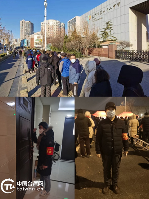 天津市委台办全体党员干部以社区工作志愿者的身份投身到天津核酸“大筛”的服务保障之中。(中国台湾网发)