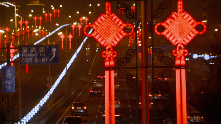 首都街头张灯结彩,充满浓浓的年味。图为1月30日拍摄的北京市复兴路夜景。(新华社记者李欣摄)