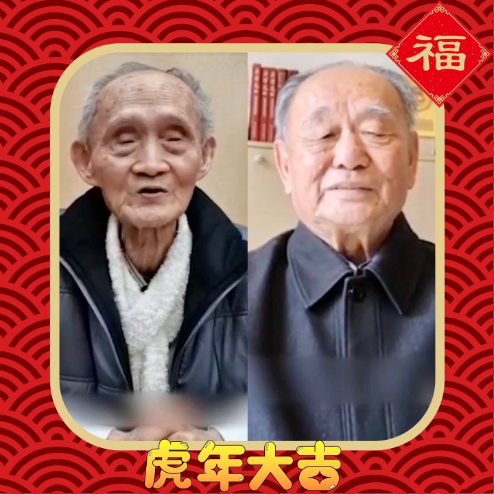 图为96岁的大陆新闻学泰斗方汉奇向台湾98岁的新闻学大家李瞻拜年的视频截图。