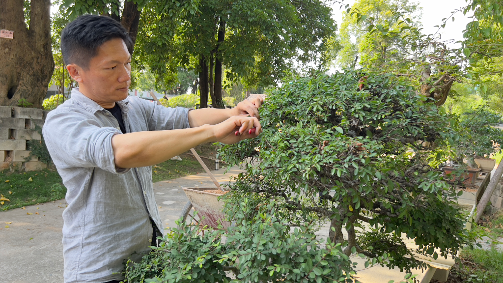 陈岱明在修剪园中植物。新华社记者 付敏 摄