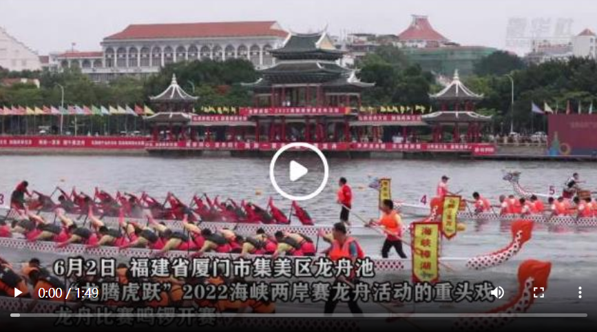 6月2日,福建省厦门市集美区龙舟池,云旗猎猎,雷鼓嘈嘈。“龙腾虎跃”2022海峡两岸赛龙舟活动的重头戏——龙舟比赛鸣锣开赛!由在闽台胞、台商、台青组成的17支台胞队伍,与24支大陆队伍御龙逐浪,通过赛龙舟这项历史悠久的中华传统民俗活动,共同迎接端午佳节到来。
