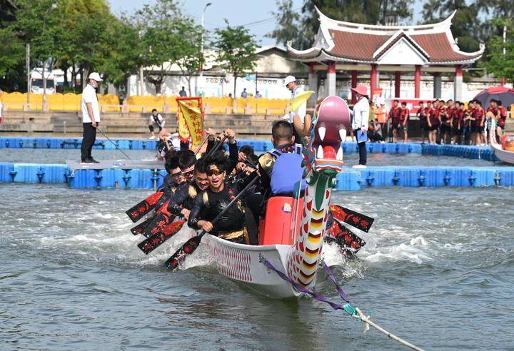6月2日,“海芋·台胞社工队”在“龙腾虎跃”2022海峡两岸龙舟赛300米直道赛的预赛中冲过终点。新华社记者林善传摄