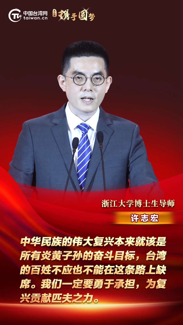 第二届“携手圆梦——两岸同胞交流研讨活动”7日在北京开幕。浙江大学博士生导师许志宏在致辞时表示,中华民族的伟大复兴本来就该是所有炎黄子孙的奋斗目标,台湾的百姓不应也不能在这条路上缺席。我们一定要勇于承担,为复兴贡献匹夫之力。