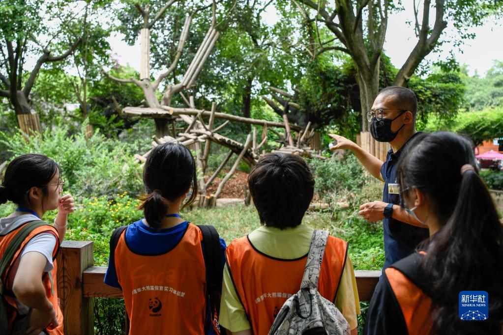 7月18日,在成都大熊猫繁育研究基地,动物饲养管理部主管袁博(右二)给参加体验营的两岸大学生介绍大熊猫环境丰容相关内容。