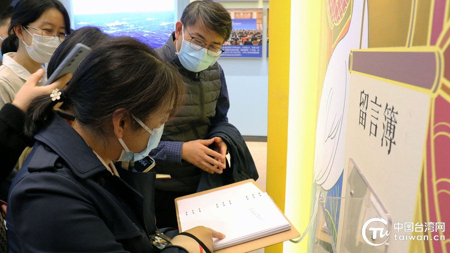 在“坚持‘一国两制’ 推进祖国统一”单元,参观者纷纷在留言簿中写下对祖国统一期待的文字。图为参观者翻阅、热议留言簿中留言。(中国台湾网 张玲 摄)