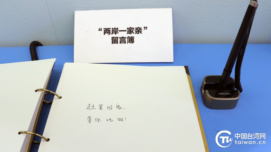 在“坚持‘一国两制’ 推进祖国统一”单元,参观者在“两岸一家亲”留言簿上写道:“赶紧回家,等你吃饭!”(中国台湾网 张玲 摄)