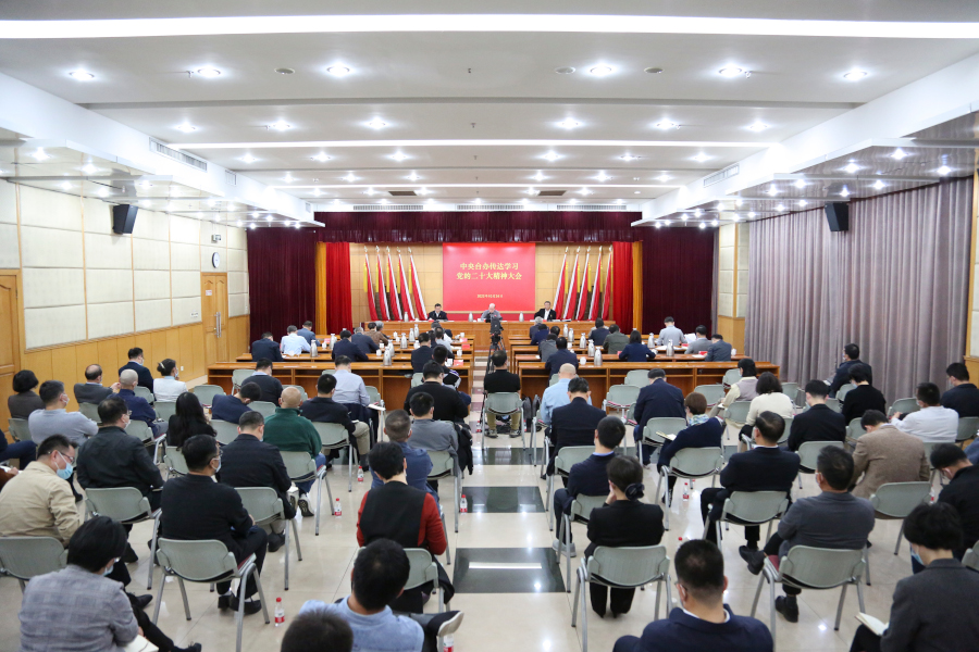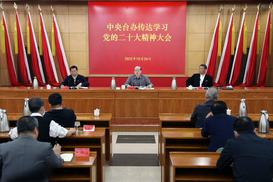 10月24日,中央台办主任刘结一主持召开全办党员干部大会,传达学习党的二十大精神,部署全办学习宣传贯彻工作。出席党的二十大的代表刘结一、陈元丰、潘贤掌同志分别传达了党的二十大和二十届一中全会精神、大会通过的十九届中央纪委工作报告精神及《中国共产党党章(修正案)》精神。办领导、海协会领导出席会议。